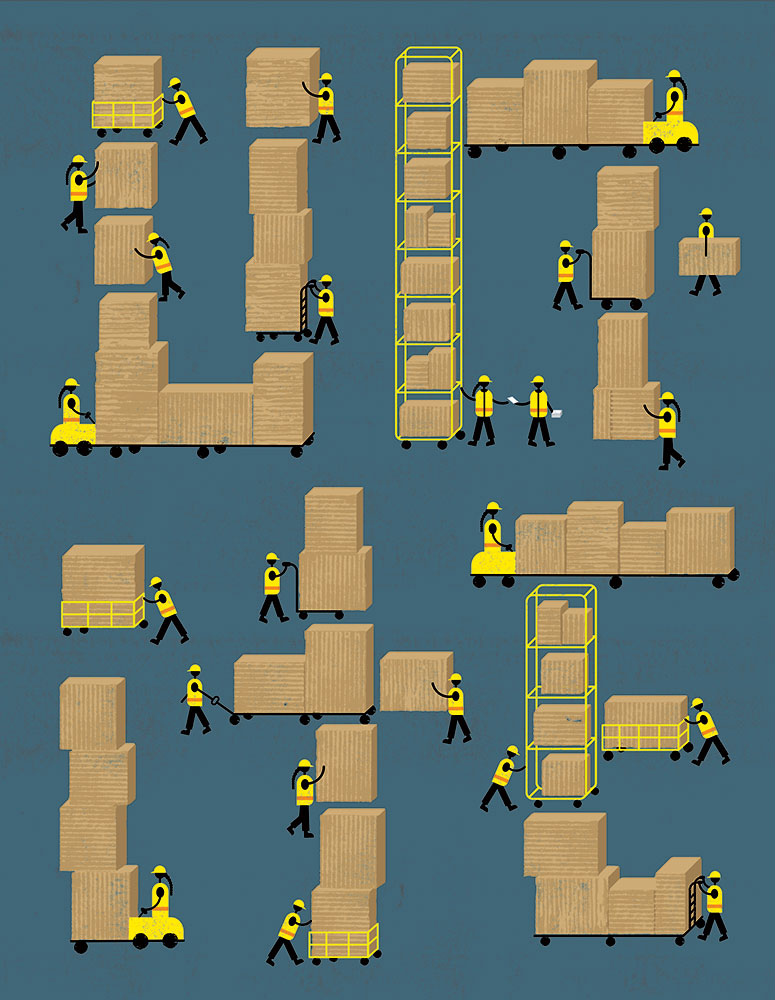 When you apply for a job as an “associate” at an Amazon warehouse, you don’t have to attach a résumé or supply references. All you have to provide is your name and your Social Security number, and the automated hiring system conducts a basic background check within minutes. If you clear that, congratulations—you got the job! Next you’re invited to a “hiring appointment” at a nondescript office building, where you shuffle into a line with dozens of other new hires, surrounded by banners in Amazon’s signature blue emblazoned with the company’s “Leadership Principles”: “Bias for Action,” “Learn and Be Curious,” “Customer Obsession.” You are photographed, drug-tested, and told, verbally, what your start date and schedule will be.